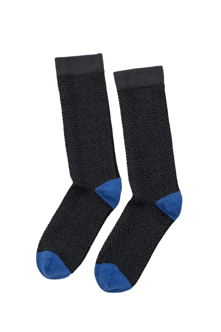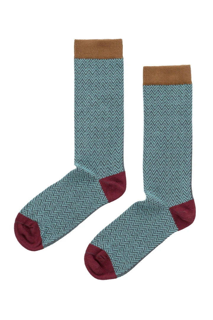 ziggity zag. we love a herringbone and these socks get a pop of whimsy with their contrast toe and heel cap. crafted from an organic cotton knit, that has the perfect amount of stretch, these will retain their shape and elasticity for years, as well as segue seamlessly from work to weekend.