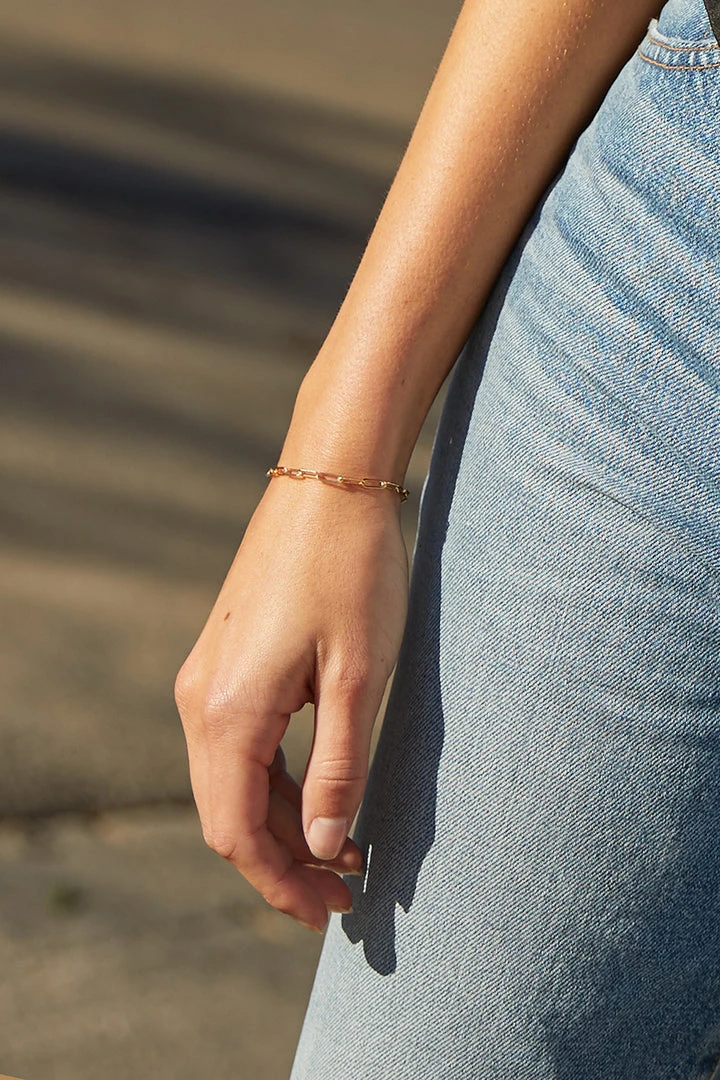 Your missing link. Crafted from a gold-filled chunky chain with elongated links, this bracelet feels has a nice weight to it and feels classically cool. Fully adjustable and closes securely with a lobster clasp. Great layered with other bangles or bracelets.