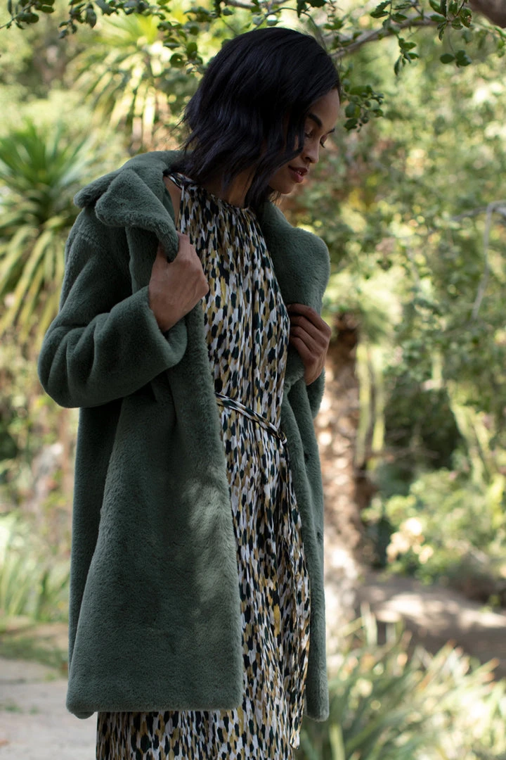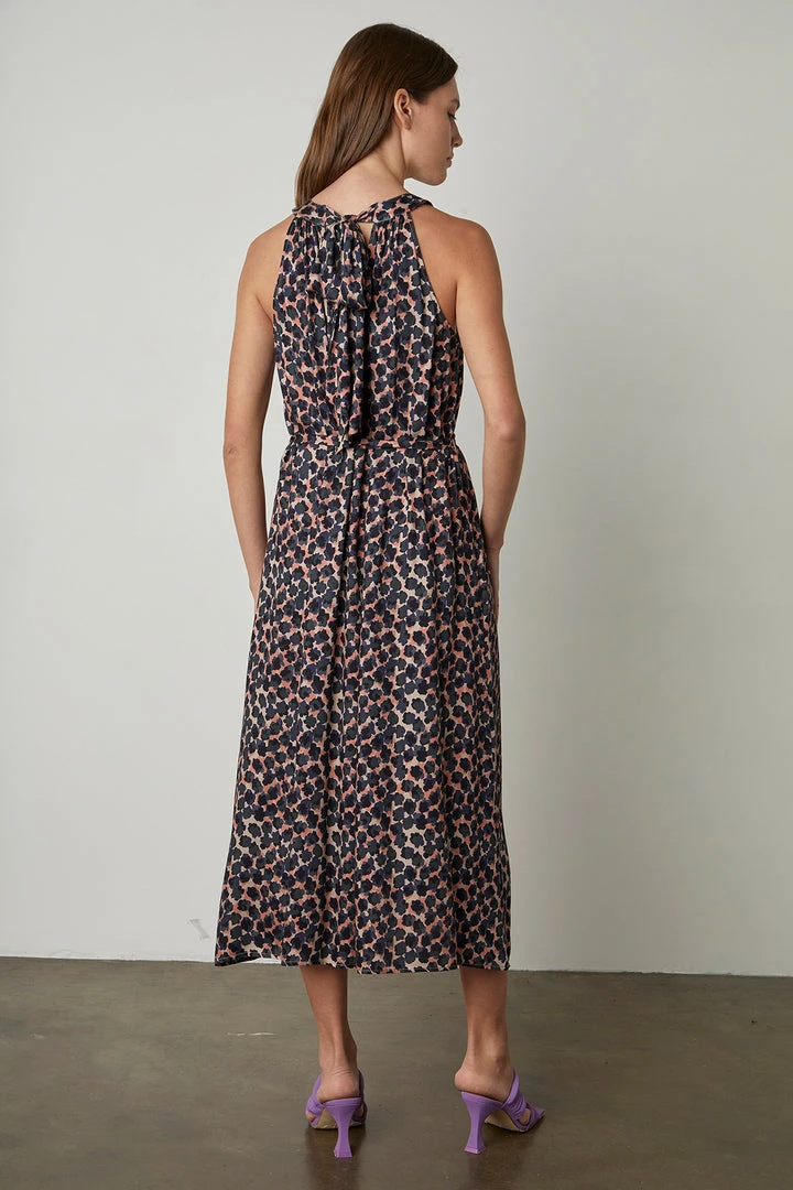 A shimmering satin with a painterly print, this holiday dress has a flattering, halter neckline with a dramatic tie at the back. Detach the belt for a diaphanous silhouette or keep it cinched.