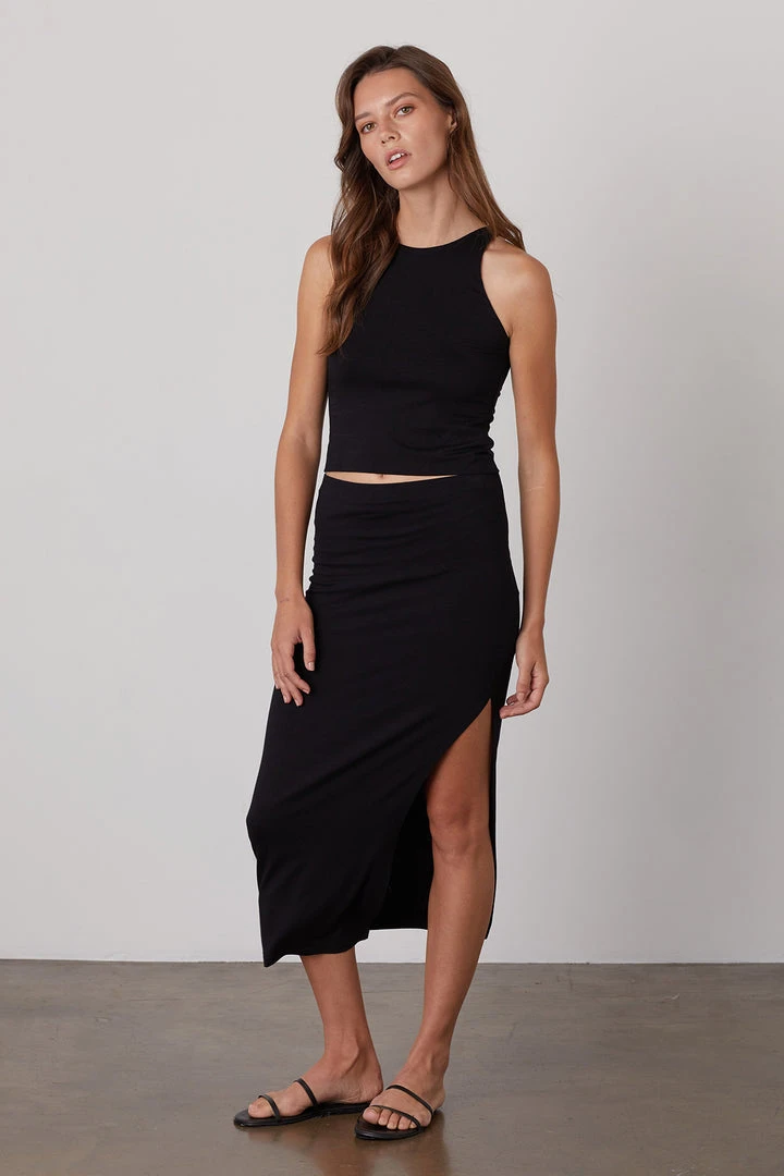Understated simplicity, this skirt is truly the underpinning of vacation style. Crafted from a medium-weight knit jersey and in a timeless column silhouette with a high slit for day-to-night appeal.