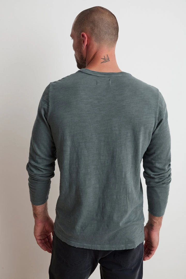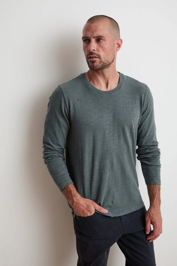 We did the hard work by lightly distressing this long sleeve tee which lends a cool, vintage look. Slightly heavier than our regular cotton slub but the same signature texture.