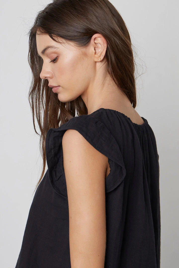 Our cotton gauze is always a favorite and this top is the epitome of effortless. An elastic neckline lends a delicate volume and a flutter sleeve caps it off.