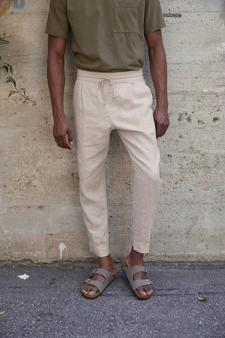 A very cool and casual trouser crafted from a woven linen. An elastic waist with a drawstring and a slightly tapered silhouette to the leg. Feel free to cuff.