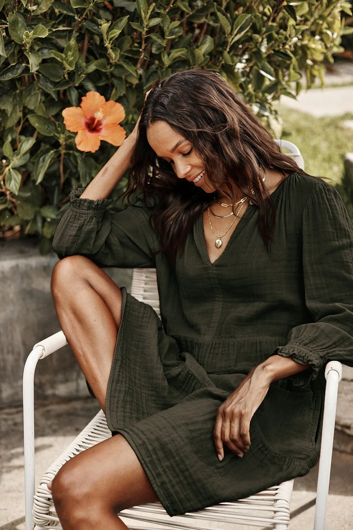 In a vibrant hue and with a relaxed silhouette, this dress is laid back and charming. Featuring a tiered skirt and a cinched cuff at the wrists, it’s made for spring afternoons and beyond.