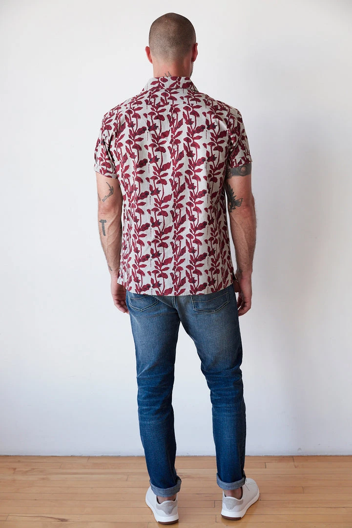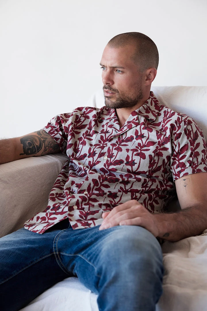 In the style of a classic cabana shirt, this one features a Bali-inspired print and a casual 5-button-down front with an open traditional collar.