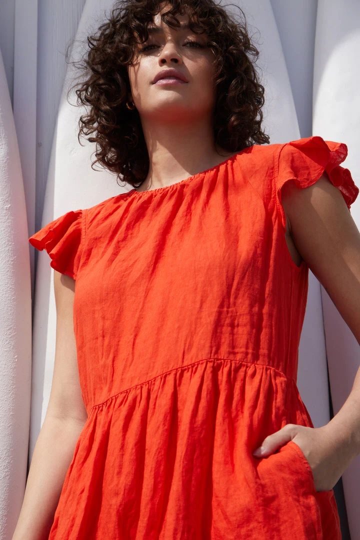A dress that seems destined for a summer outdoors (day or night). Our lightweight linen in a drop waist silhouette offers a casual femininity with flutter sleeves and a gathered elastic neckline.
