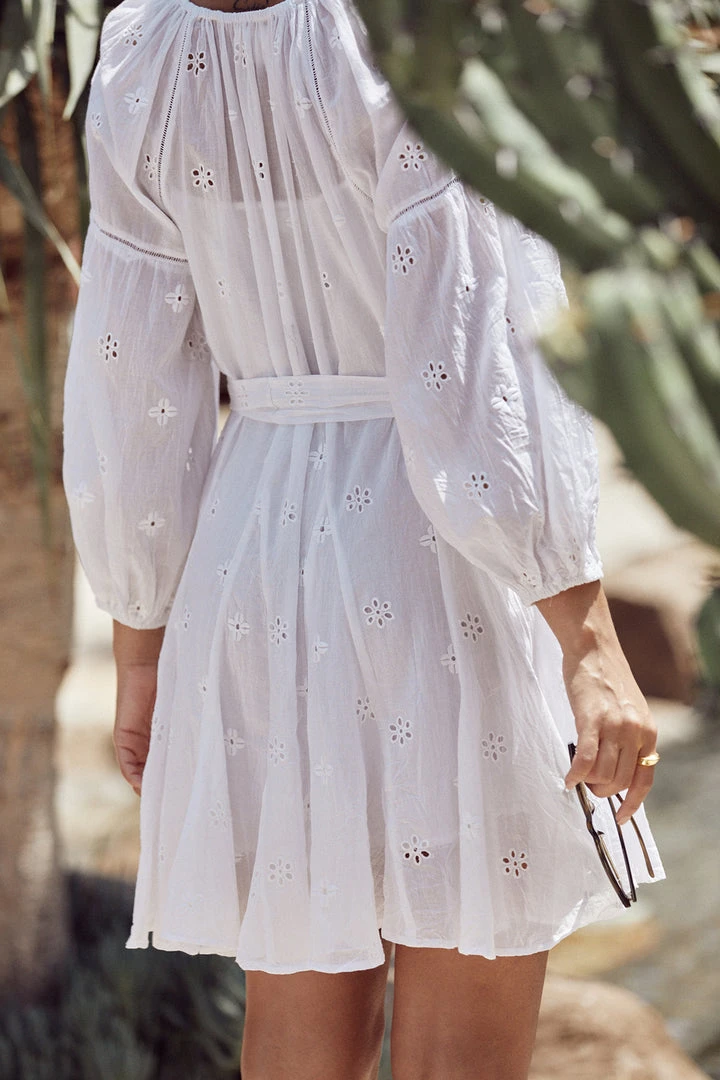 The rules of summer are all about breezy cotton and artisan details. This dress features vertical pleats that add a flattering fullness to the skirt, all-over eyelet embroideries and cotton crochet trims.