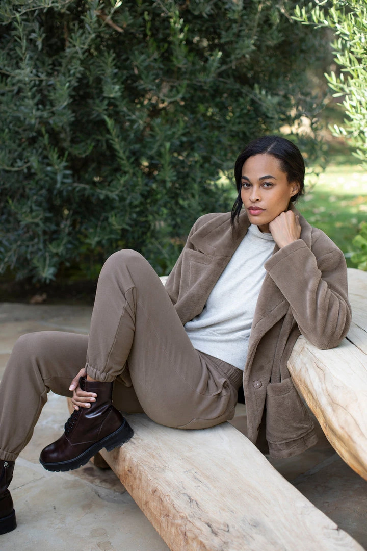 Reminiscent of a vintage double-breasted design, this coat delivers a soft sophistication with the dusty mocha hue and incredibly soft faux fur. Jumbo pockets and an exaggerated collar keep it interesting.