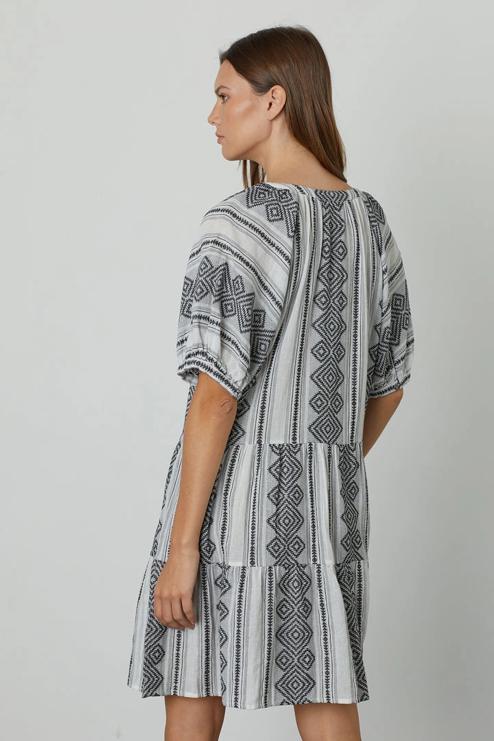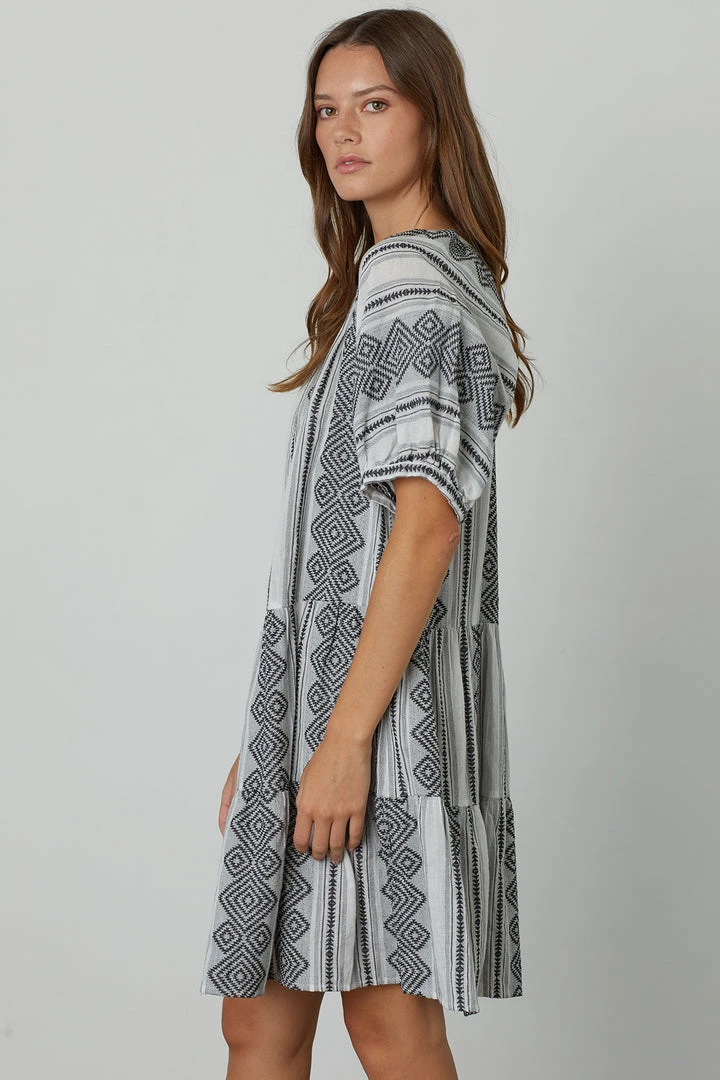 With its Mediterranean-inspired jacquard design in a striking two-tone colorway, this pop-on dress is simply effortless. A flared skirt of tiered layers and a gently puffed sleeve add to the vacation inspiration.